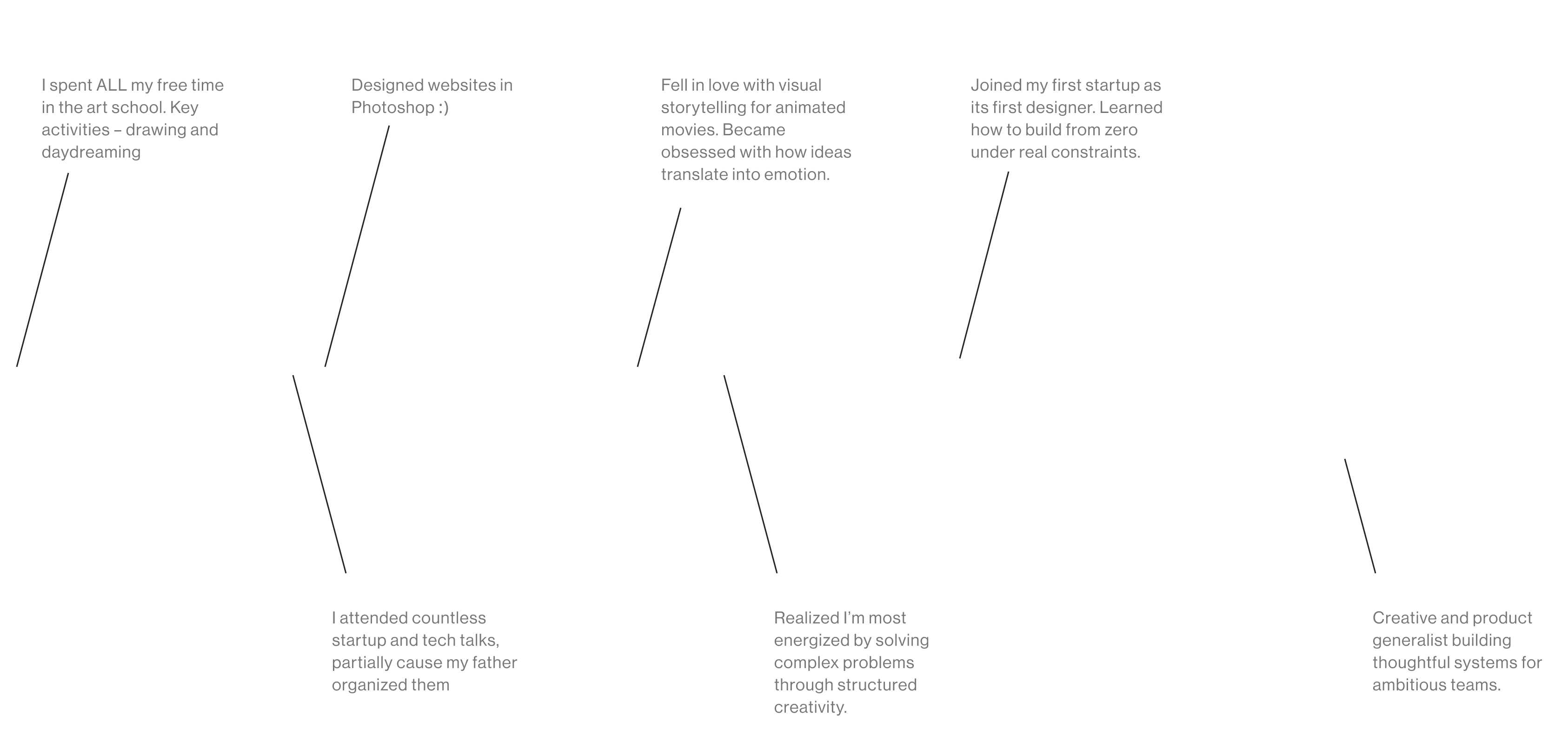 My background in the visual arts keeps my standards for craft high. Years of building in fast-moving, high-constraint environments have made me pragmatic and calm under pressure. I am comfortable defining direction at the system level and refining a single interaction until it feels right.