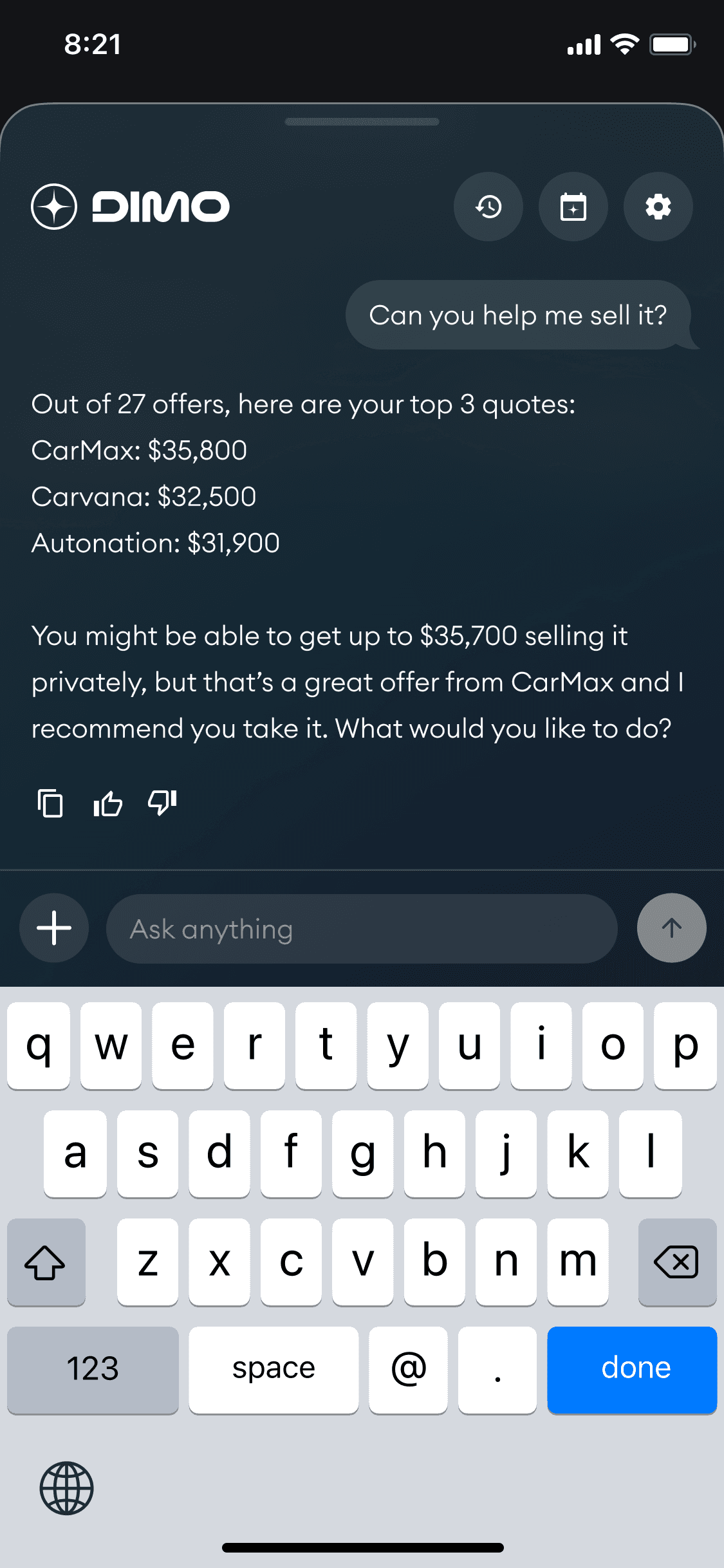 After early experimentation, we stepped back and reframed the problem from first principles. Instead of asking where AI could fit, we asked what people actually need from their car. Drivers care about saving money, staying safe, planning maintenance, understanding costs, and selling at the right time. Some of that value works without live data, but real time signals make it significantly stronger.