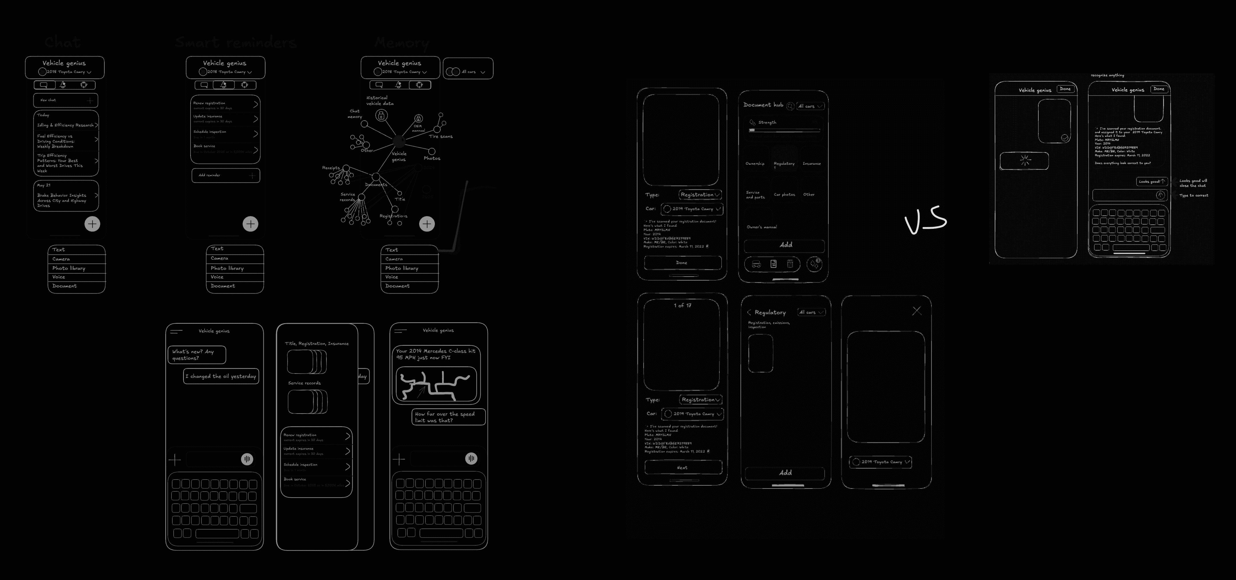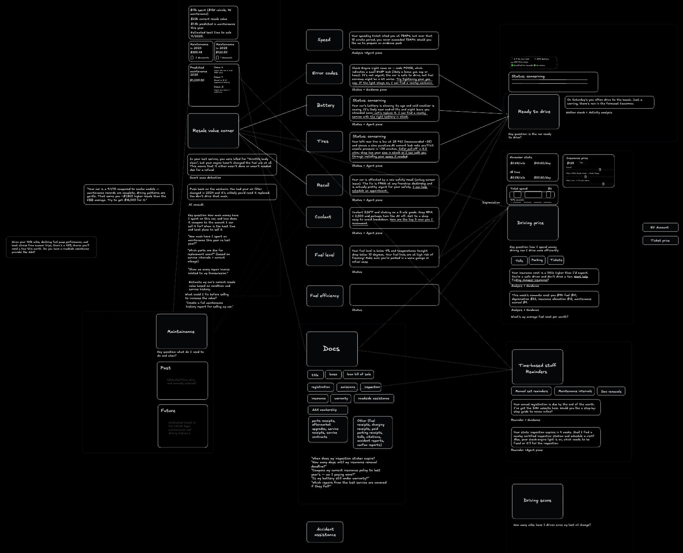 To avoid incremental thinking, I mapped every data signal against potential ownership questions and decisions. The result was a comprehensive mindmap connecting telemetry, documents, and financial context to insight surfaces such as resale timing, total driving cost, maintenance forecasting, and price per mile.