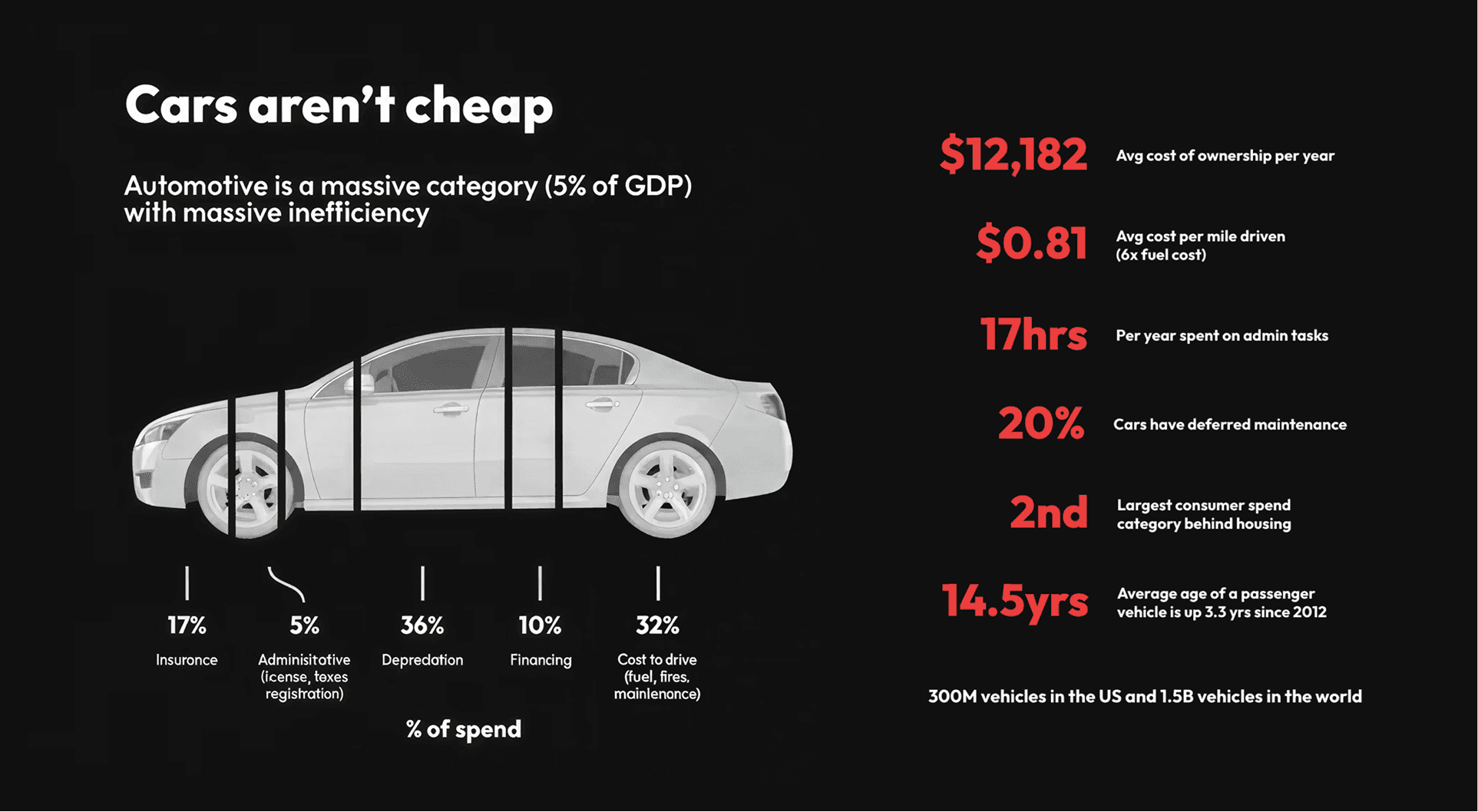 Automotive is one of the largest consumer spend categories, yet ownership remains fragmented and opaque. Cars are expensive to purchase, insure, maintain, and repair. Most drivers do not understand the tradeoffs, timing, or risks involved. Anxiety around being overcharged or missing critical maintenance is high.