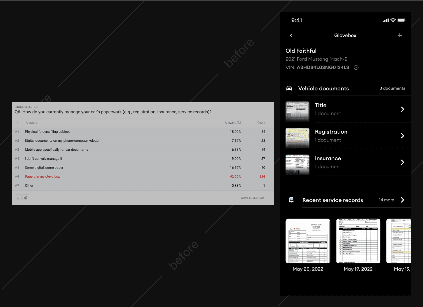 We began integrating AI into the existing mobile app and uncovered a structural opportunity around documents. 42 percent of surveyed users managed critical car paperwork as loose papers in their glovebox, creating friction and risk. They could not quickly answer questions about coverage or service history and were exposed to missed renewals or lost documents.