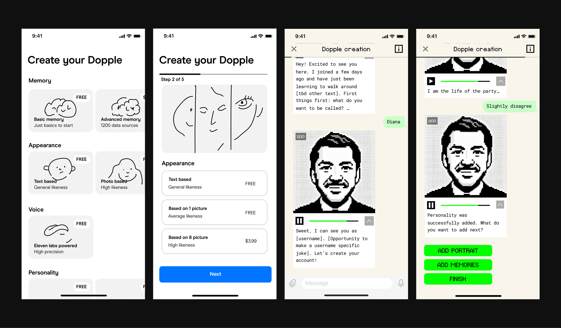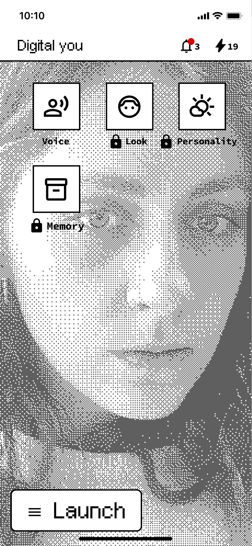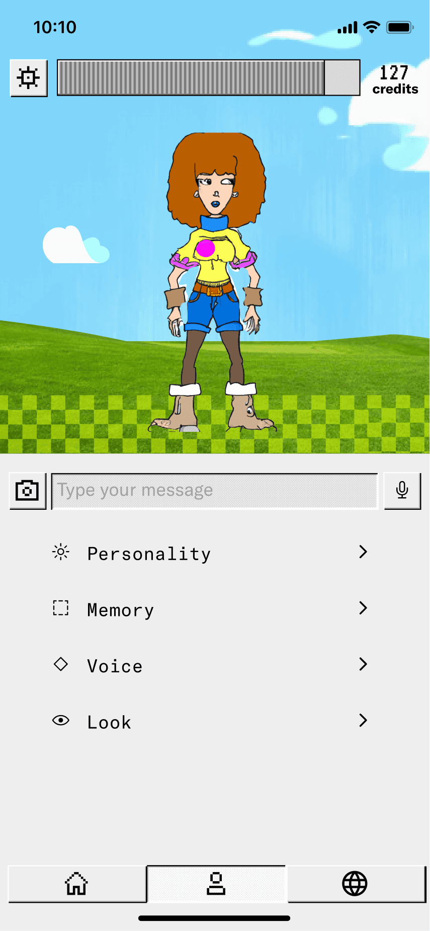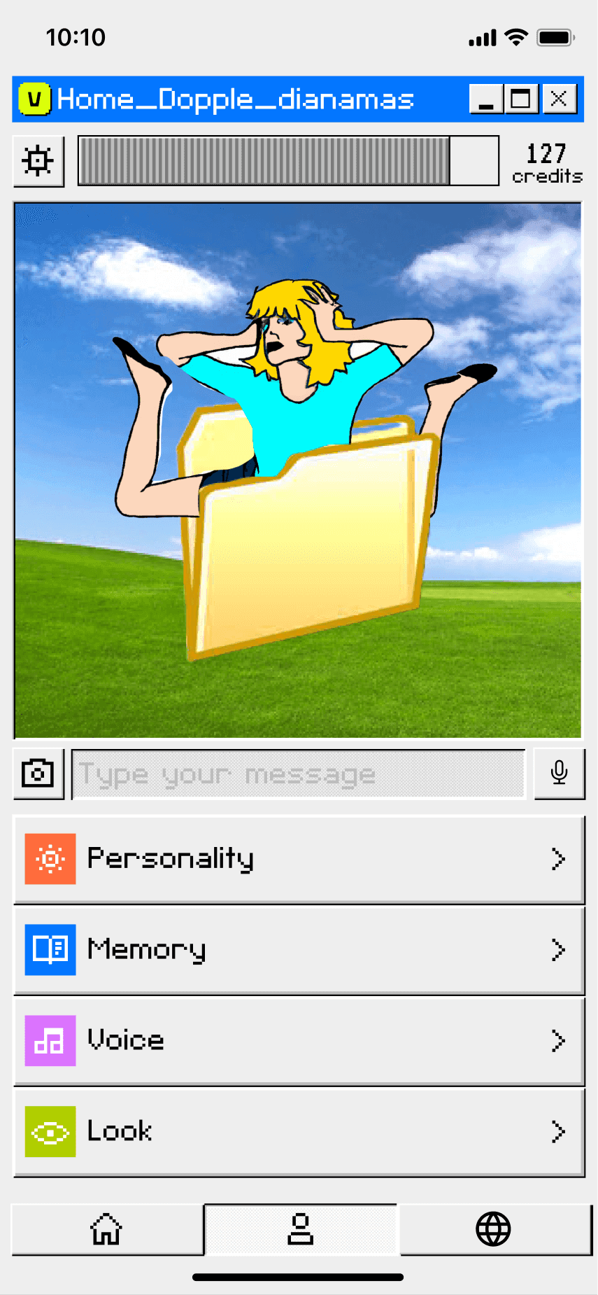 The concept evolved into a human caricature that lets users create miniature digital versions of themselves in the app. To enhance perceptions of security, we experimented with Progressive Web Apps to reinforce the idea that these digital copies remain on the user's device. We also embraced a deliberately low-tech aesthetic to manage expectations and avoid the intimidation often associated with near-human AI agents.