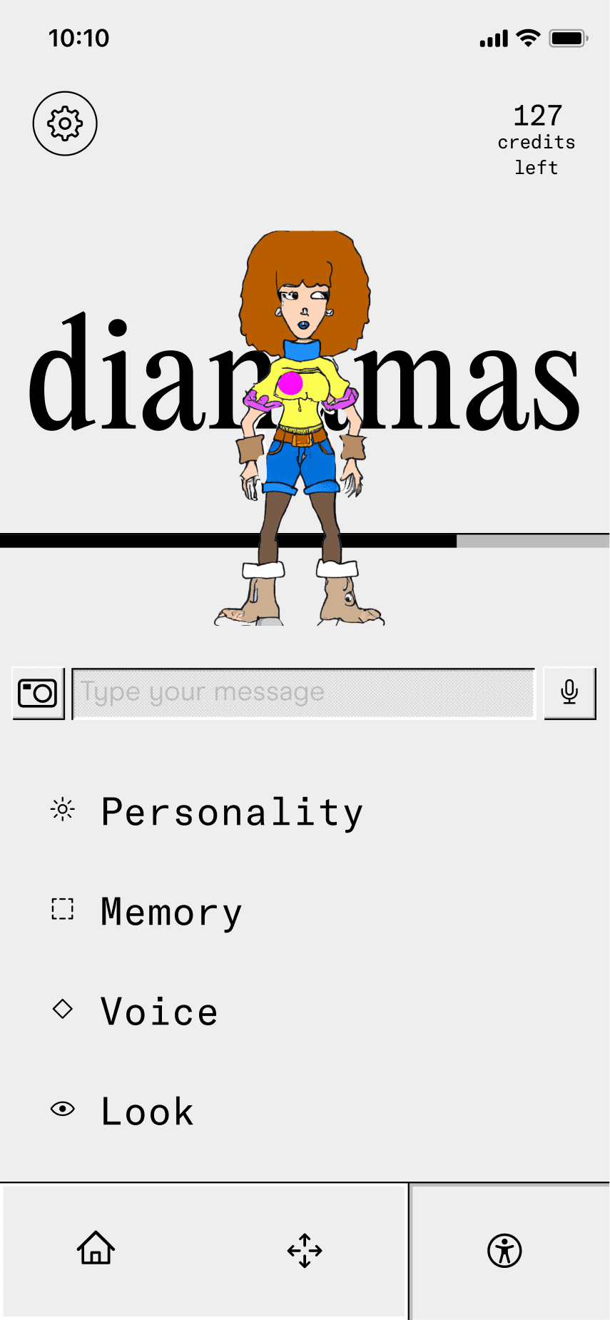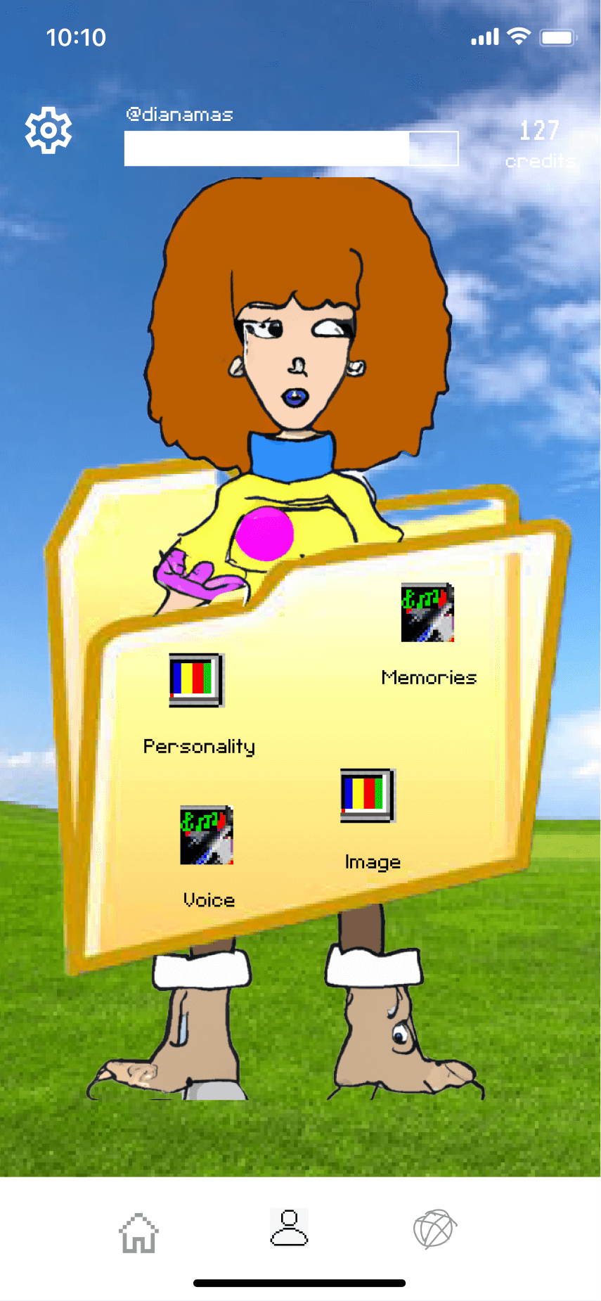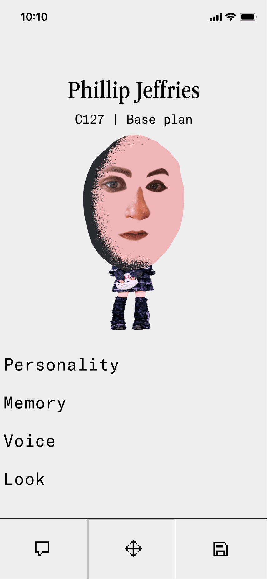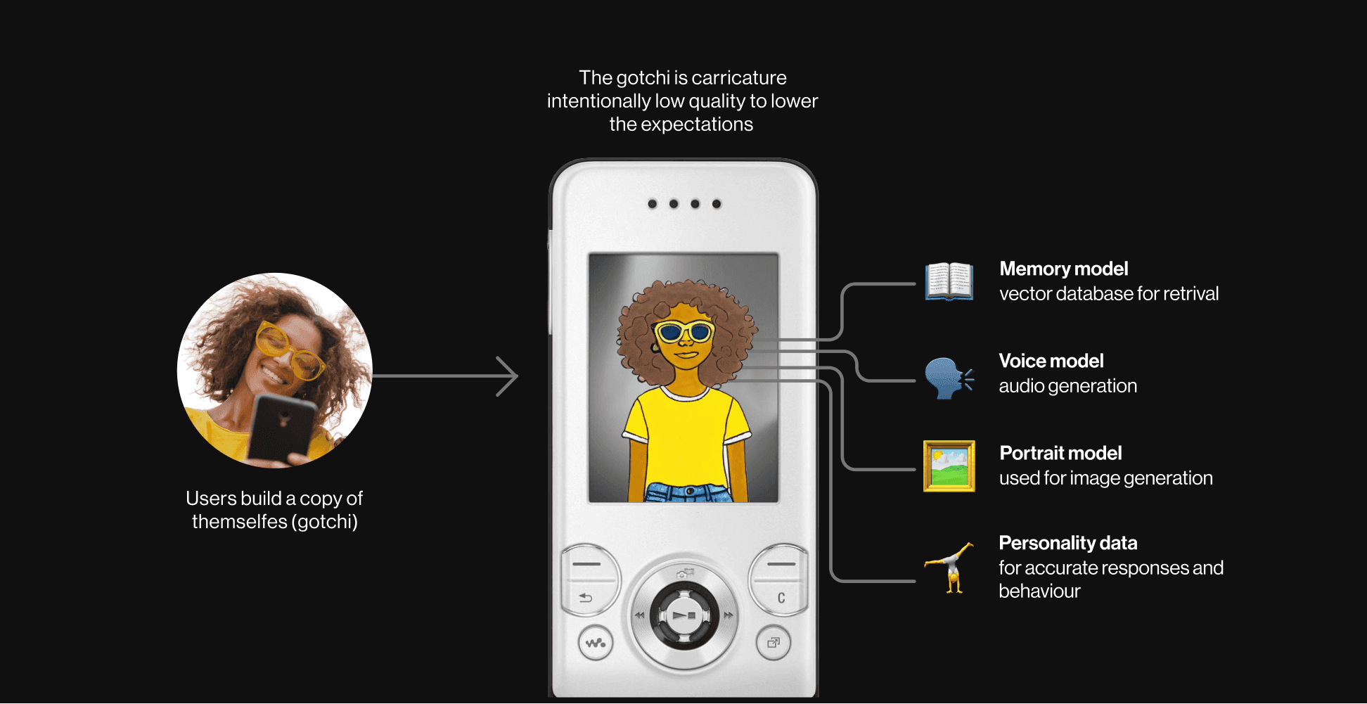 The concept evolved into a human caricature that lets users create miniature digital versions of themselves in the app. To enhance perceptions of security, we experimented with Progressive Web Apps to reinforce the idea that these digital copies remain on the user's device. We also embraced a deliberately low-tech aesthetic to manage expectations and avoid the intimidation often associated with near-human AI agents.
