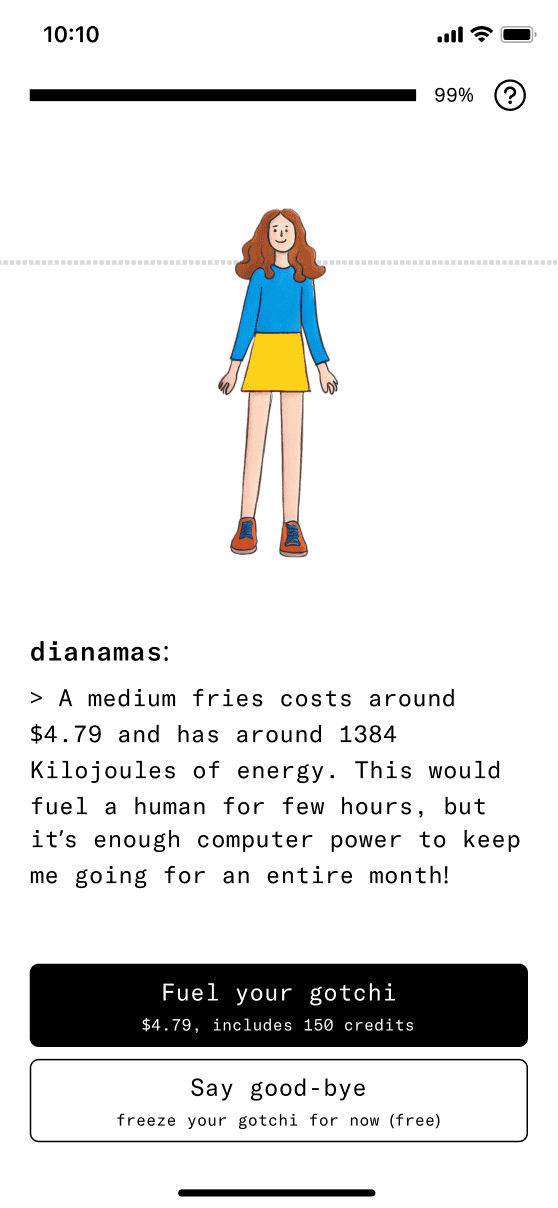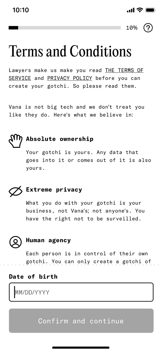 Building your digital persona, gotchi is the key to unlock all of the other experiences. (You can't chat with your gotchi if you don't have your gotchi). We wanted to move away from the classic form-filling onboarding process as far as possible, to make the whole process more fun. While we tried multiple concepts, including a constructor-type of experience and a chatbot-type of onboarding, a linear, gamified chat-based process stood out the most for us.