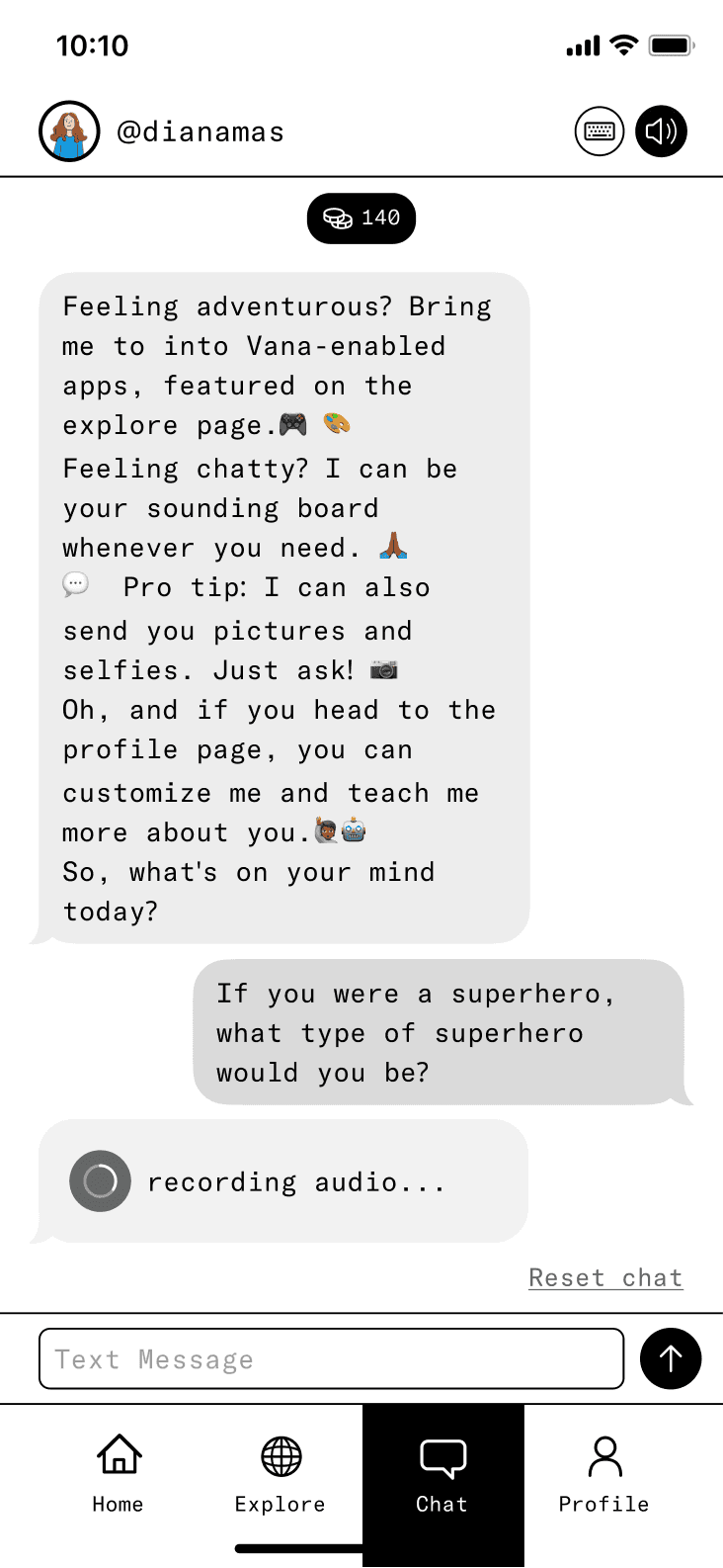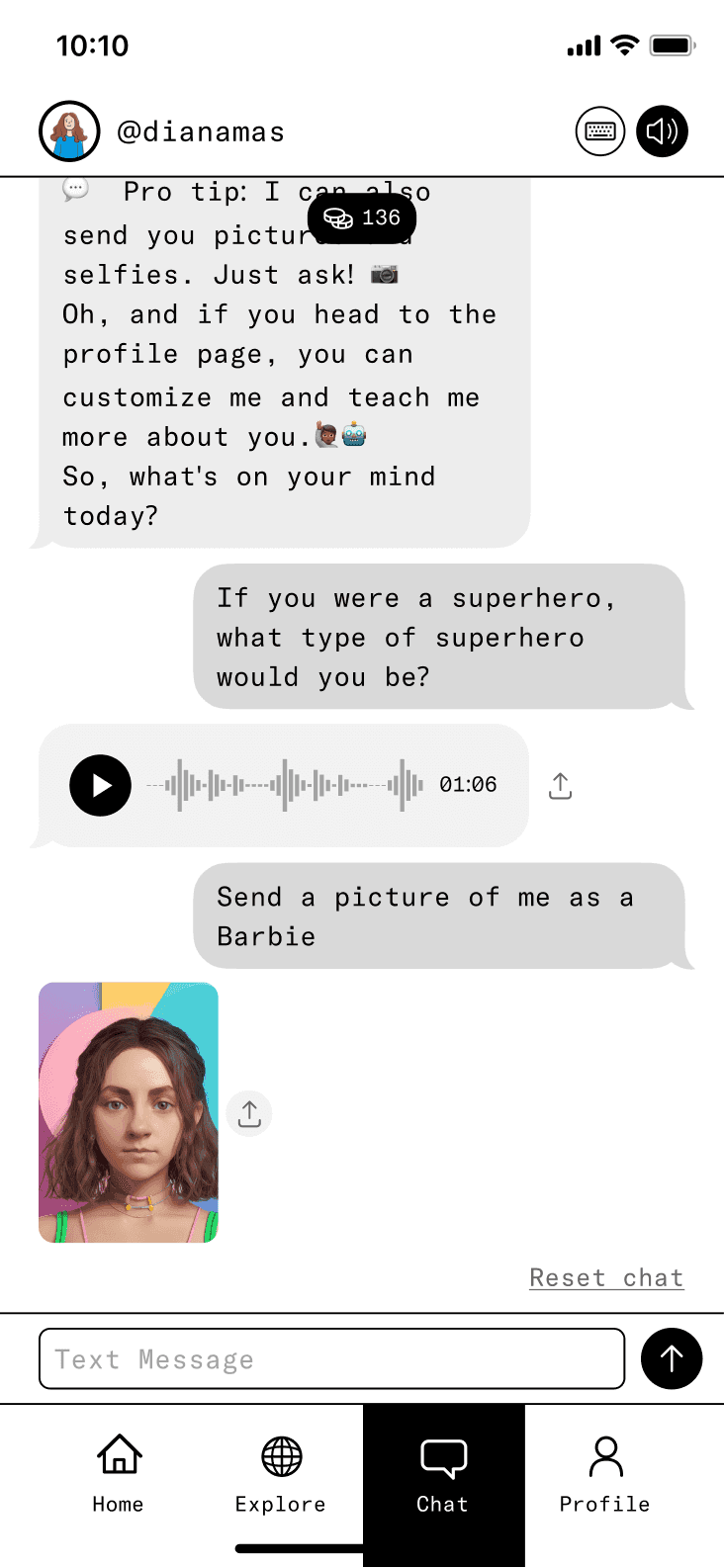 Chat was a critical component of our app, demanding flawless execution. We aimed to captivate users by making their default voice the primary mode of communication, with the option to switch to text to prevent monotony from constant voice messages. Additionally, our chat feature enabled the creation of multimedia content via natural-language commands. We clearly indicated the type of content being generated, which testing confirmed improved clarity and made content loading more tolerable. Furthermore, to enhance virality, we strategically placed a share button to facilitate easy content sharing.