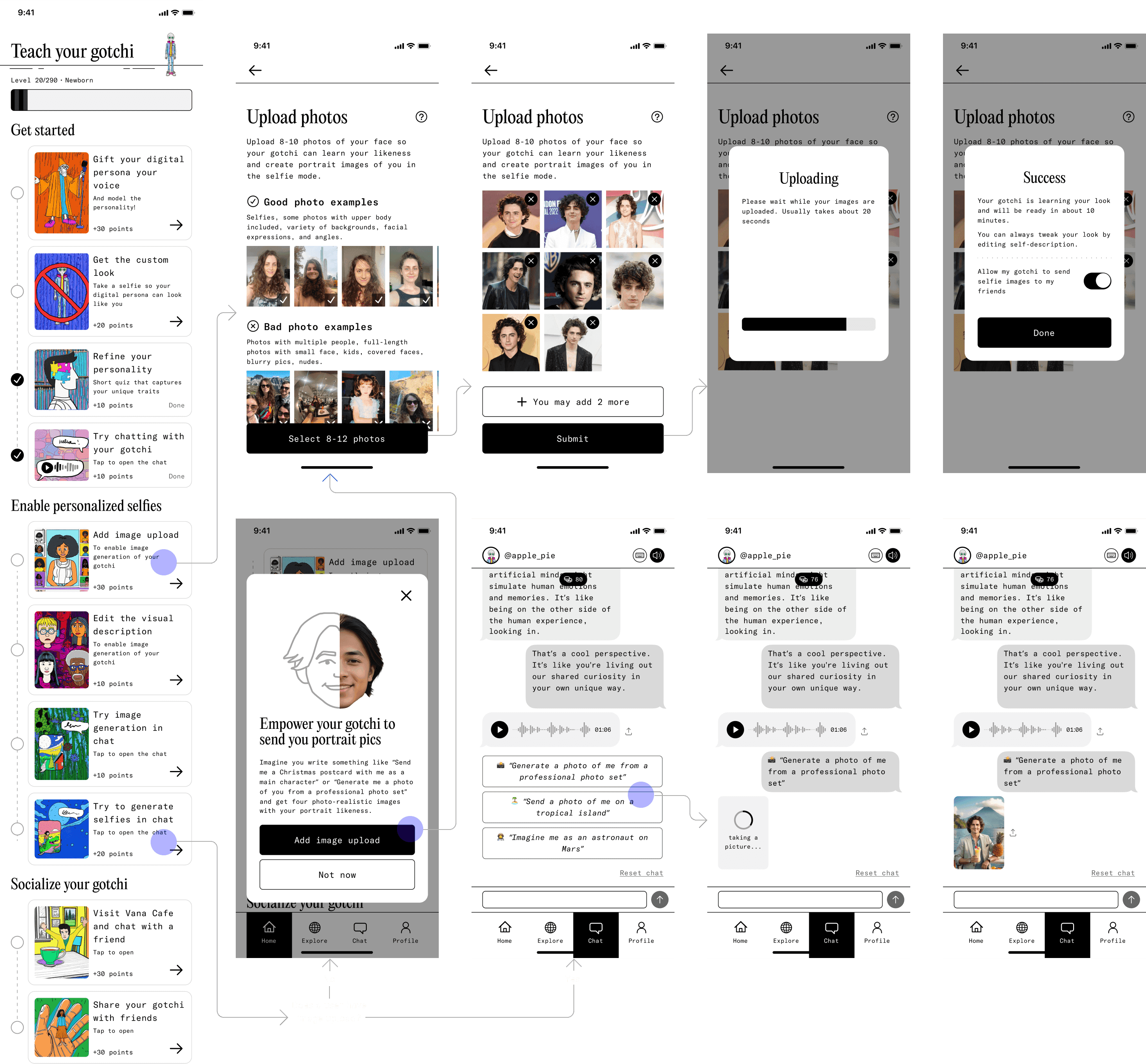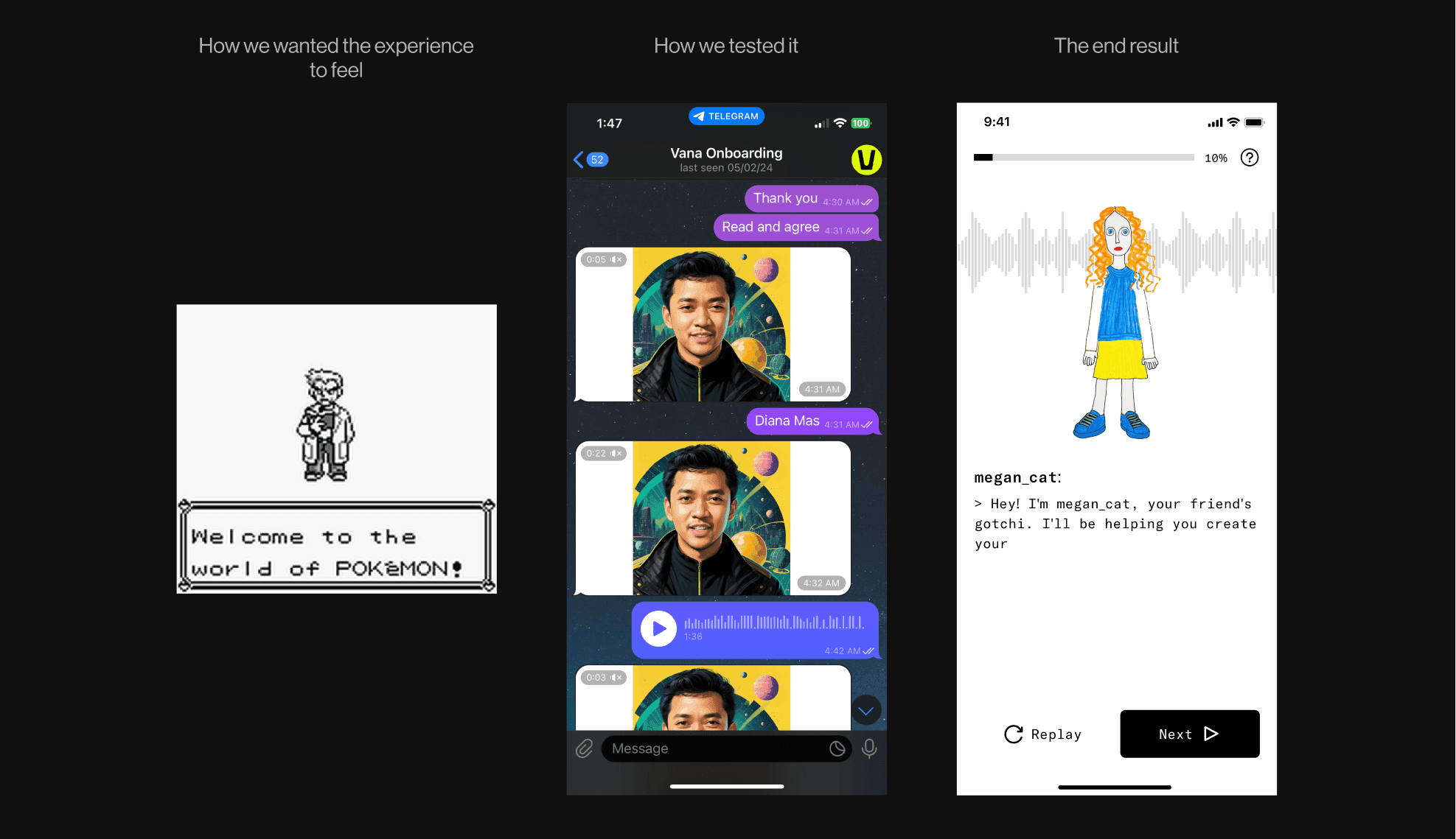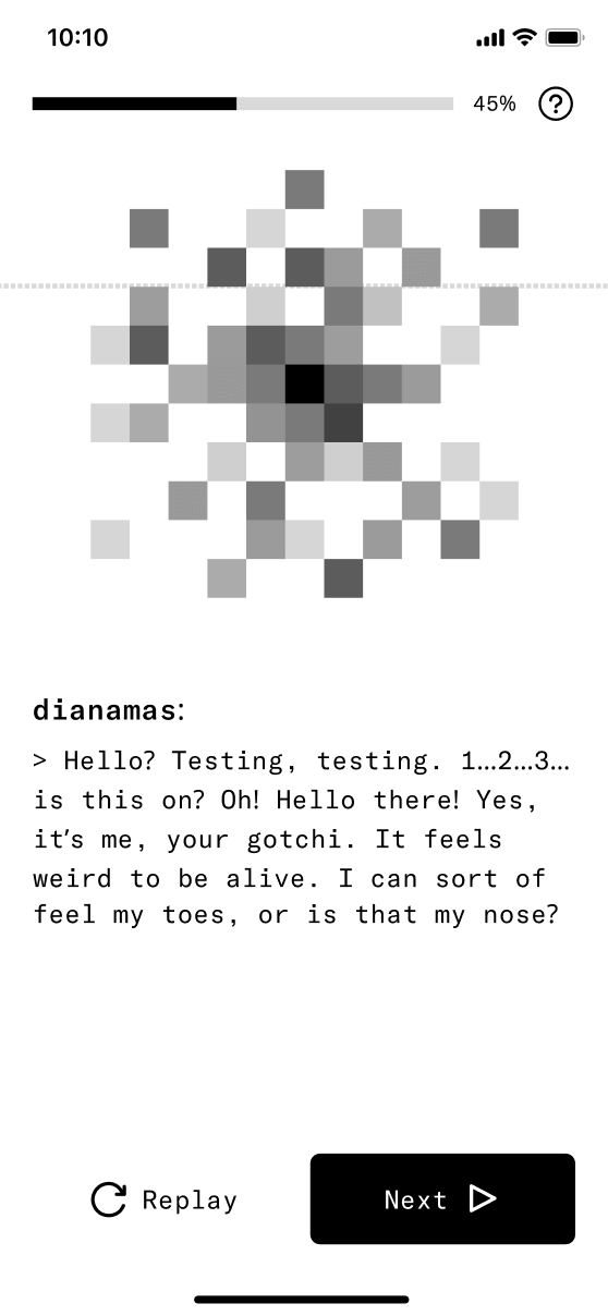 In our final onboarding designs, we incorporated the successful techniques from our tests. A special guide greets each new user, their friend's gotchi, which makes the process both unique and personal. We enhanced engagement by linking onboarding steps with delightful mini revelations.